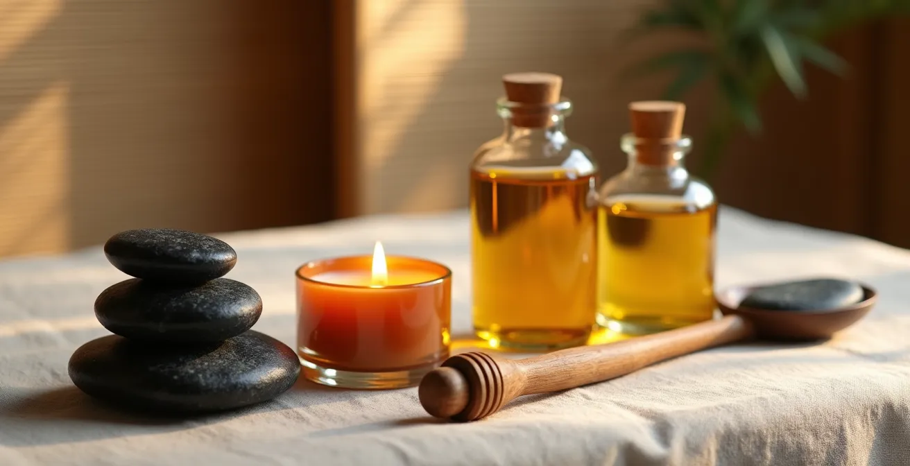 Cette préparation thermique devient encore plus puissante lorsqu’elle est combinée avec d’autres sources de chaleur. Comme le démontre une approche synergique, l’application d’huiles végétales chauffées avant l’utilisation des pierres chaudes agit comme un véritable conducteur thermique, permettant à la chaleur des pierres de pénétrer plus profondément. L’huile chaude ouvre la porte, et la pierre chaude entre pour travailler en profondeur. C’est une combinaison exponentielle : la chaleur de l’huile facilite l’action de la chaleur de la pierre, pour une relaxation plus rapide et plus durable.